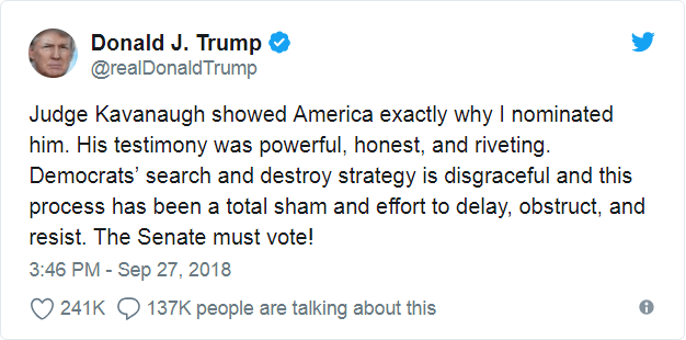 And, with a third woman, Julie Swetnick who came forward to accuse him, according to a statement published on Wednesday by her lawyer, Michael Avenatti, Kavanaugh is pushed to the wall. Of course, Trump supported his supreme court pick with a tweet on Wednesday, at the UN in New York: “Avenatti is a third-rate lawyer, who is good at making false accusations, like he did on me and like he is now doing on Judge Brett Kavanaugh. He is just looking for attention and doesn’t want people to look at his past record and relationships—a total low-life!”